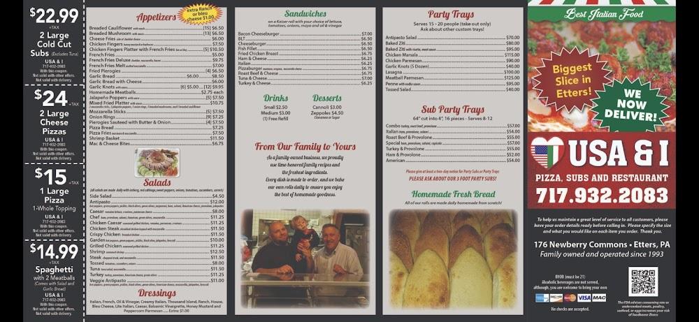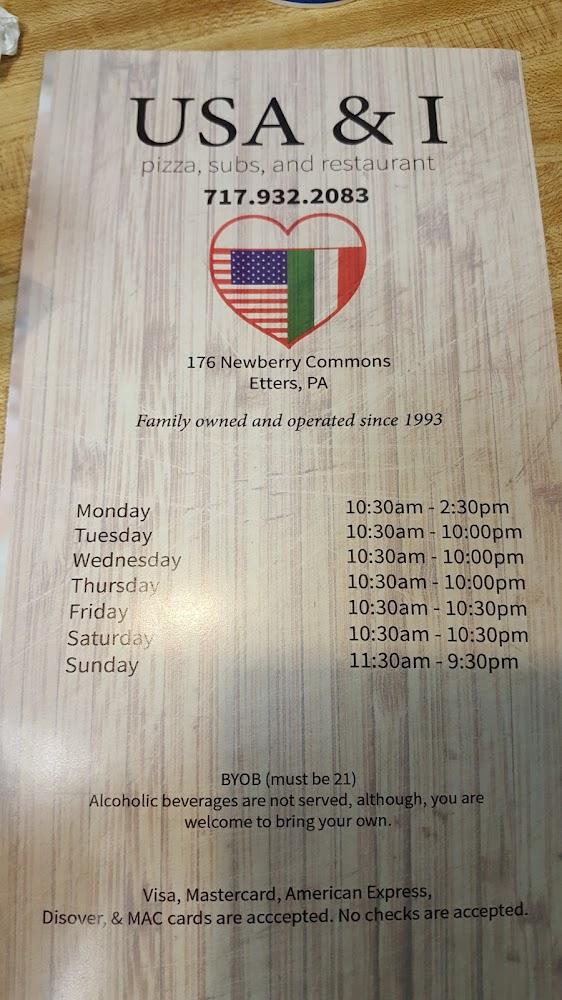 Welcome to USA & I, your go-to pizzeria located in the heart of Etters, PA. Enjoy a relaxed dining experience with our delicious local specialties, fast service, and a comfortable ambiance perfect for families, groups, and solo diners. With both indoor seating and a terrace, we offer a variety of options, including takeout and drive-thru services. Our menu caters to all preferences, featuring vegetarian and vegan dishes, along with refreshments like coffee and alcohol. Accessible for everyone, we also provide amenities like Wi-Fi, high chairs for kids, and a welcoming atmosphere. Join us for lunch or dinner today!
